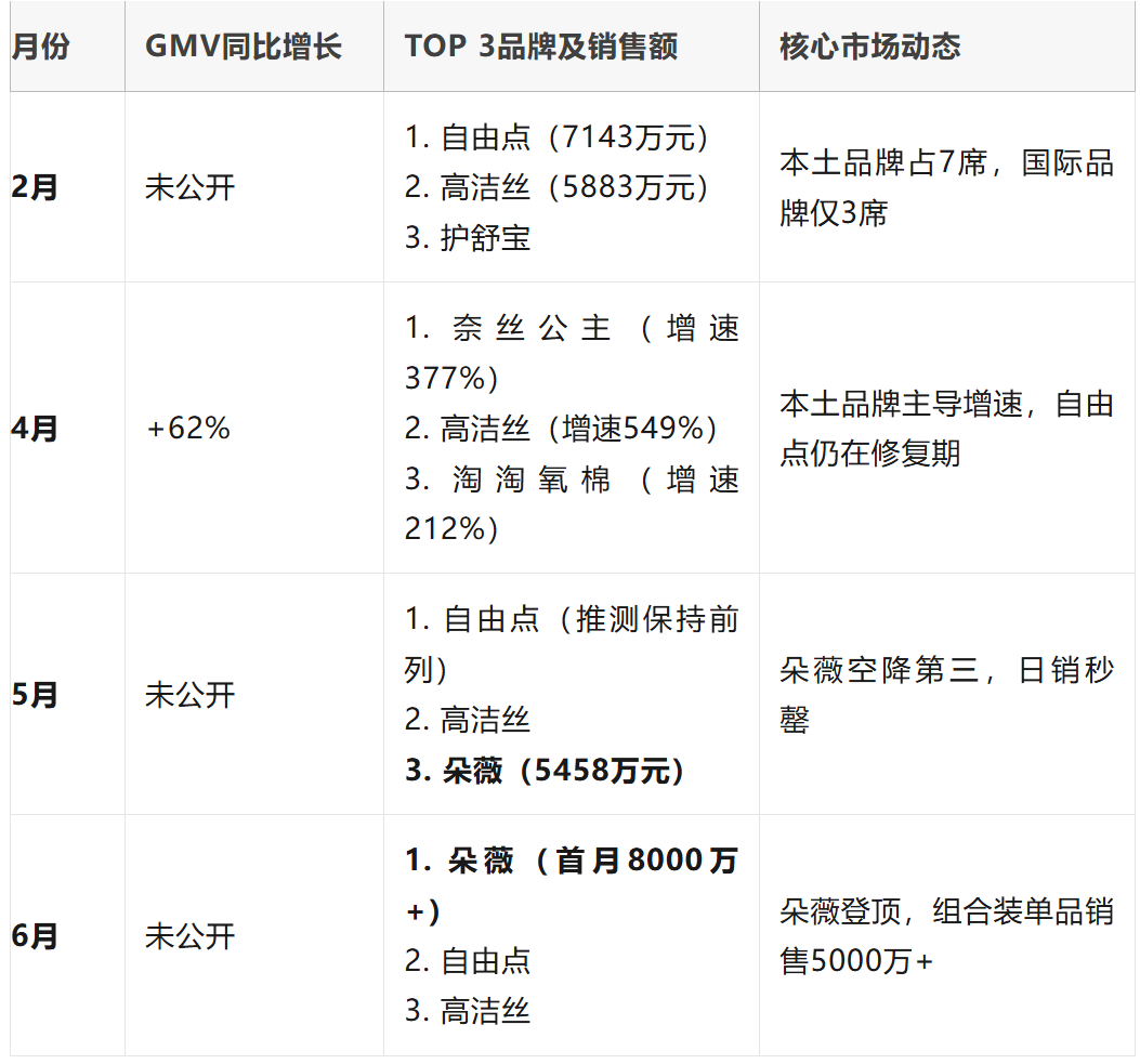 增速亮点:淘淘氧棉、洁婷等本土品牌同比增速超50%,高洁丝增速达549%。